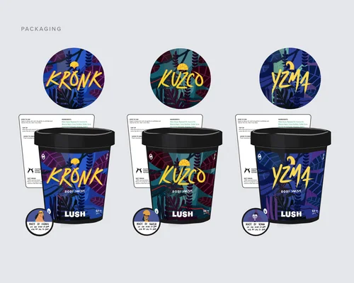 The packaging not only reflects the quality and ethos of the LUSH brand but also incorporate elements of 'The Emperor’s New Groove' and the character, Kronk. The design is visually appealing, engaging, and instantly recognizable to fans of the movie.